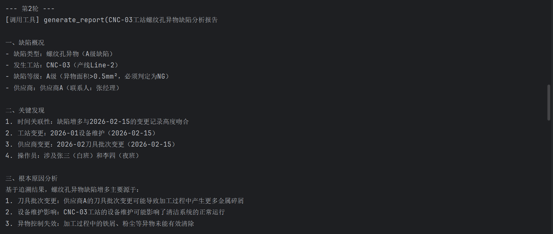 Agent自主完成了四轮推理:先追溯根因,再查标准,然后生成报告,最后综合输出。全程没有任何if-else告诉它该怎么做。